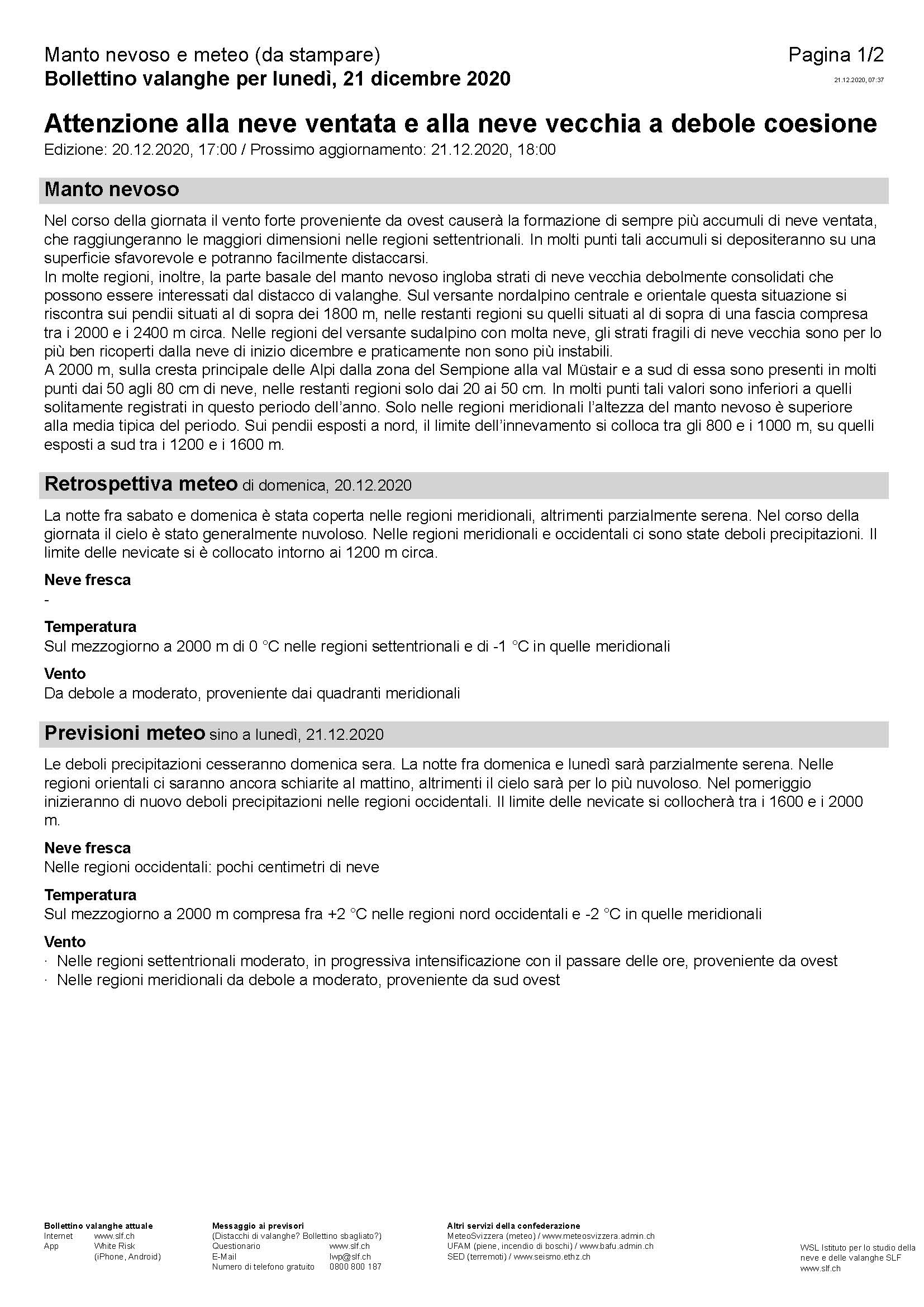 «L’Istituto Federale per lo studio della neve e delle valanghe di Weissfluhjoch/Davos informa»: molti conoscono questa frase ancora dalla radio. Il bollettino valanghe, il servizio più noto dell’SLF, veniva però diffuso anche tramite i giornali, la TV e il telefono, oggi soprattutto via internet e l’app White Risk. Il bollettino valanghe è la più vecchia allerta contro i pericoli naturali della Svizzera e un mandato legale che l’SLF oggi soddisfa da 75 anni. Il 21.12.1945 veniva pubblicata la prima edizione del bollettino valanghe, stampato tra gli altri anche dal giornale Neue Zürcher Zeitung.