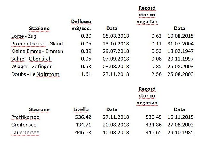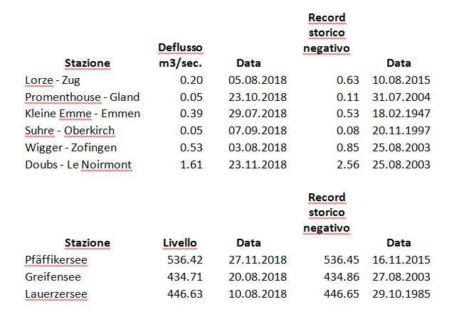 Alcuni valori di portata dei fiumi e del livello dei laghi hanno raggiunto minimi storici da record assoluto (vedi tabella nella galleria foto sottostante) e per mesi i livelli della falda freatica sono rimaste sotto la norma sul versante nord delle Alpi. Anche in agricoltura la siccità ha portato a significative perdite di raccolto. Le alte temperature associate alla carenza idrica hanno causato uno depigmentazione precoce delle foglie in molti luoghi, mentre la disponibilità idrica per le specie arboree più diffuse in Svizzera è scesa ben al di sotto dei valori medi sul lungo periodo (vedi grafico nella galleria foto).