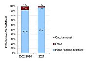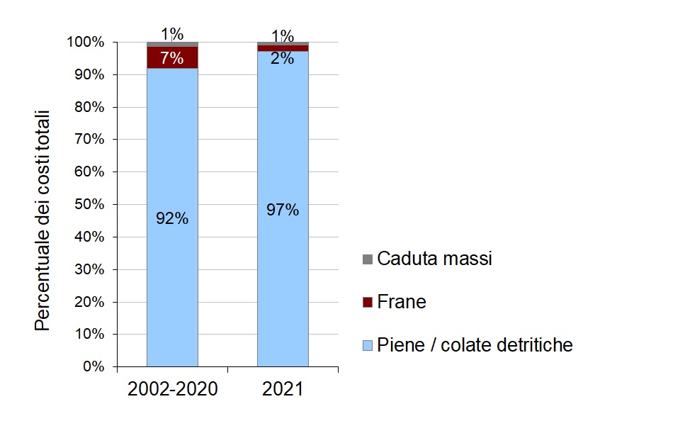 L’estate del 2021, caratterizzata da abbondanti precipitazioni e temporali, ha avuto forti ripercussioni sui costi dei danni provocati dal maltempo, che per la prima volta dal 2007 hanno nettamente superato la media al netto del rincaro dal 1972 al 2020, pari a circa 300 milioni di franchi, e vanno ad occupare il nono posto nella classifica dei 50 anni oggetto di monitoraggio. La quota di gran lunga preponderante dei costi (97%) è stata causata da inondazioni dovute a straripamenti e ruscellamento superficiale nei mesi di giugno e luglio. Nel Cantone di Basilea Campagna le inondazioni hanno causato una vittima.