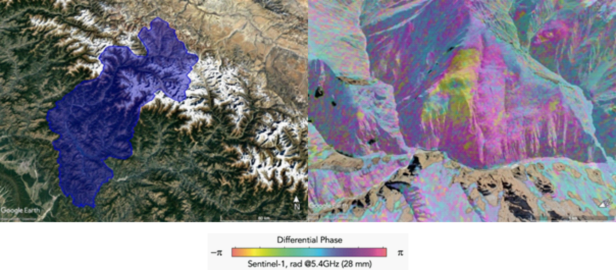 Die differenzielle Radarinterferometrie d. h., DInSAR (Link), ermöglicht es uns, grossflächige Bodenveränderungsinformationen zu erfassen und mit aussergewöhnlich hoher Genauigkeit zu identifizieren. Benutzt werden die Phasendifferenzen zwischen multi-temporalen Bildern, welche von Satelliten Radaren über der gleichen Region aufgenommen wurden, um so grossflächige Bodenveränderungskarten erstellen zu können.  Die Oberflächenveränderung wird entlang der Sichtline gemessen, wobei die Genauigkeit je nach Untersuchungsobjekt und Qualität der Satellitenbilder bis zu einigen Millimetern betragen kann. Seit den 90er Jahren sind systematische Akquisitionen erhältlich, welche es ermöglichen, rückwirkende Analysen durchzuführen und Langzeittrends zu identifizieren. Wir brauchen diese Methoden in verschiedenen Gebieten der Welt, um so die räumliche und zeitliche Entwicklung von Massenbewegungen zu verstehen. Diese Daten bilden die Grundlage für wissenschaftliche Fortschritte, um die Bedingungen und auslösenden Faktoren alpiner Massenbewegungen zu verstehen und um quantitative Bewertungen des Gefahrenpotenzial zu unternehmen.