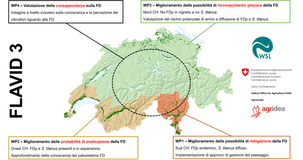 - WP3: Valutazione del rischio potenziale di arrivo e diffusione di FD e S. titanus in aree attualmente prive di FDp e dei suoi vettori (nessuna FDp nei vigneti, S. titanus assente; area di studio: Svizzera settentrionale);