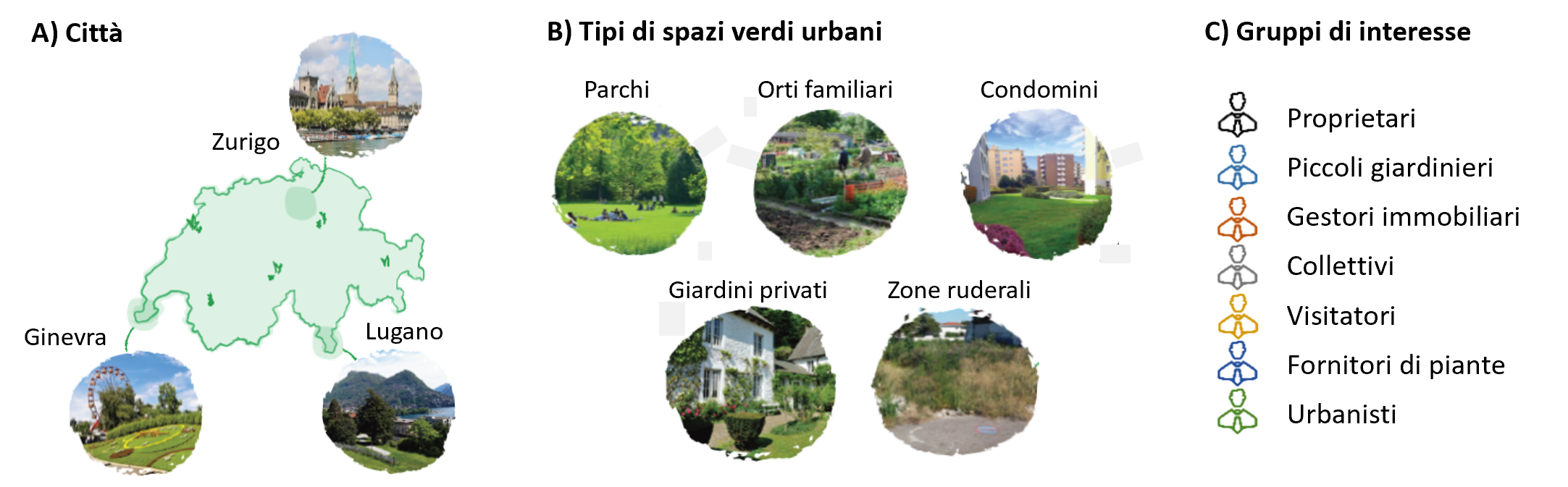 Il progetto è iniziato nel 2023 e durerà fino al 2027. Sono coinvolte tre città svizzere (Lugano, Ginevra e Zurigo) in rappresentanza di tre regioni biogeografiche distinte e altrettante realtà linguistiche e socioculturali. Il progetto si concentra sulle principali tipologie di spazi verdi urbani (giardini privati, giardini familiari, parchi, condomini, e aree ruderali), per un totale di 180 siti (60 siti per città) (vedi Figura 2).