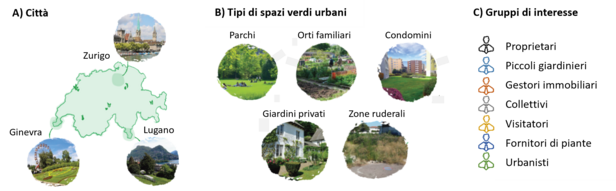 Il progetto è iniziato nel 2023 e durerà fino al 2027. Sono coinvolte tre città svizzere (Lugano, Ginevra e Zurigo) in rappresentanza di tre regioni biogeografiche distinte e altrettante realtà linguistiche e socioculturali. Il progetto si concentra sulle principali tipologie di spazi verdi urbani (giardini privati, giardini familiari, parchi, condomini, e aree ruderali), per un totale di 180 siti (60 siti per città) (vedi Figura 2).