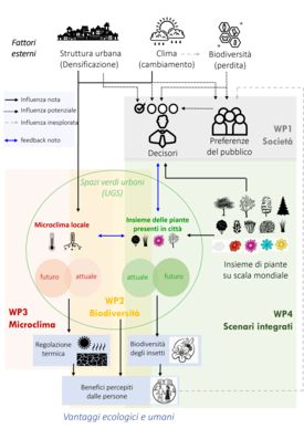 Le domande di ricerca sono affrontate da quattro moduli distinti (work packages, WP) ma ben integrati tra loro (vedi Figura 3): Società (WP1), Biodiversità (WP2), Microclima (WP3) e Scenari integrati (WP4):
