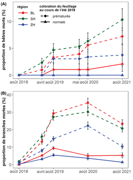 La mortalité a été bien plus faible parmi les sujets qui ont perdu normalement leurs feuilles en automne 2018: à Bâle-Campagne, elle est de 2%, tandis que dans la région Knonaueramt-Bremgarten, tous les sujets ont survécu en 2021. Parallèlement aux arbres morts, 21% des hêtres observés ont été abattus au cours de l’étude, le plus souvent pour des raisons de sécurité. En 2020, soit la deuxième année après la sécheresse estivale, la proportion de branches mortes a atteint un pic de 25% du volume du houppier (fig. 5b). Ensuite, la proportion de branches mortes a de nouveau légèrement diminué, de nouvelles branches ayant repoussé. Cette observation pourrait être le signe d’une reprise de croissance, au moins temporaire.