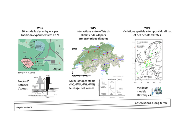 Les forêts sont exposées de changements environnementales, comme une déposition atmosphérique d’azote augmenté et de durées de sècheresse plus fréquentes. Entre temps le changement climatiques continues pendant que les dépôts d’azote en commencé à régressés grâce au mesures gestion de la qualité de l’air. La pollution de l’air et les effets à longues termes ont été la raison pour d’investigations intensives des écosystèmes forestiers par exemple dans le programme de coopération internationale sur les effets au forêts (ICP Forests). Les temps de rotations de stocks sont relevant pour associer les observations sois aux valeurs augmentées de dépôts d’azote en comparaison du passé, sois à la diminution dans les dernières années. Le but du projet est d’estimer les durées à au trois échelles (i) une traitement expérimente de 30 ans très en détails, (ii) d’investigations intensive des cycles d’éléments de sites ICP Forests sélectionnes avec des analyse isotopiques et (iii) de évalué d relations d’influence et d’effets avec de sites ICP Forests additionnelles.