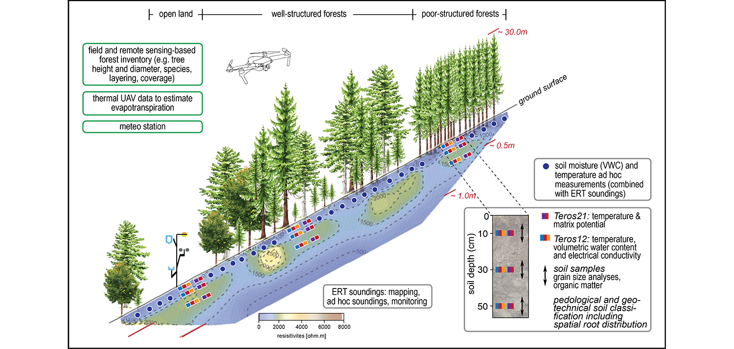 Nei potenziali «hotspot degli scivolamenti superficiali» nella regione di Davos, in boschi rispettivamente piuttosto «ben» strutturati o «mal» strutturati vengono misurati e registrati più volte al giorno il tenore in acqua, la temperatura, il potenziale di matrice e la conducibilità elettrica a diverse profondità del suolo. Mediante la tomografia di resistività elettrica (ERT) viene inoltre rilevata la variazione dell’umidità nel terreno dopo eventi precipitativi lungo una sezione bidimensionale del sottosuolo. Al fine di valutare l’evapotraspirazione, contemporaneamente ai rilievi via ERT vengono raccolti dati termici aerei tramite droni. Sulla base dei singoli profili viene inoltre effettuata una caratterizzazione geotecnica e pedologica. Allo stesso modo, bosco e terreno vengono caratterizzati e classificati anche secondo standard comuni come il codice del soprassuolo boschivo. Una stazione meteorologica rileva temperatura e umidità dell’aria, precipitazioni e irraggiamento, nonché velocità e direzione del vento.