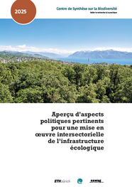 Camichel A., Richman S., Pärli R., Widmer A., Ammann J., Baumann E., … Lieberherr E. (2025) Aperçu d’aspects politiques pertinents pour une mise en oeuvre intersectorielle de l’infrastructure écologique. Centre de Synthèse sur la Biodiversité, ETH, WSL, Eawag. 26 p. doi.org/10.3929/ethz-c-000785368