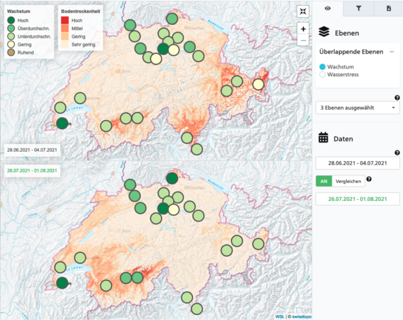 Per esempio, FORTE (fig. 1) visualizza in tempo reale lo stress idrico e la crescita di 400 alberi o il livello di defogliazione di più di 1000 alberi in tutta la Svizzera. Gli utenti possono combinare questi dati in vari modi, dal livello locale a quello nazionale, e sovrapporre dati sulla foresta come l'aridità del suolo, l'umidità della chioma o il numero di generazioni di bostrico presenti. I dati visualizzati si possono scaricare sotto forma di una sintesi con grafici e informazioni aggiuntive.