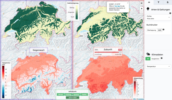 Il secondo strumento, FORTE Future, mappa l'idoneità dell'habitat di oltre 30 specie di alberi in Svizzera e la loro distribuzione potenziale nel presente e nel futuro a medio o lungo termine. Mostra chiaramente che con le temperature più alte previste e le precipitazioni estive molto ridotte, ci saranno dei perdenti (come l'abete rosso nella figura 2) ma anche dei vincitori (per esempio la quercia sessile e la quercia peduncolata).