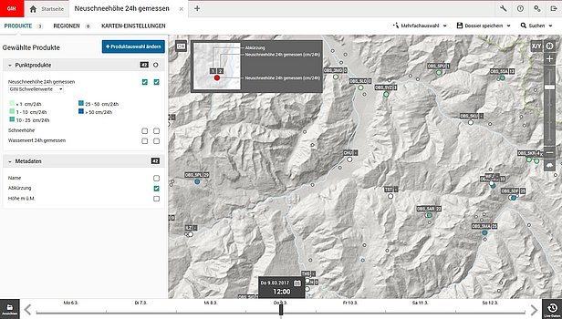 Sulla piattaforma GIN le informazioni vengono rappresentate in modo unitario sotto forma di mappe, diagrammi, tabelle, testi o immagini. Le e gli utenti della piattaforma GIN possono combinare interattivamente i dati nel modo che ritengono più opportuno. La rappresentazione in mappe fornisce una rapida panoramica sulla situazione in uno o più momenti. I diagrammi e le tabelle vengono invece usati soprattutto per visualizzare l’andamento temporale delle misure o delle osservazioni. Un’ulteriore possibilità offerta dalla piattaforma è la visualizzazione delle immagini radar in movimento delle precipitazioni, combinate con i valori di misura o le previsioni.