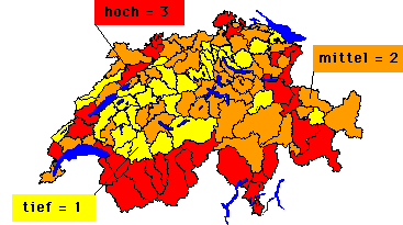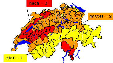 Für jede MS-Region ("mobilité spaciale") wurden die Werte der untenstehenden faunistisch und floristisch relevanten Parameter (7 bzw. 4) in Prozent des höchsten je in einer MS-Region der Schweiz auftretenden Wertes ausgedrückt und anschliessend aufsummiert. Diese regionenspezifischen Summen wurden nun untereinander verglichen und neu auf einer nationalen Rangskala von 1 (tief) bis 3 (hoch) ausgedrückt.