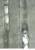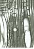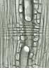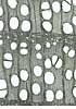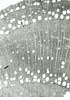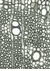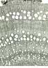 Simple perforation plates. Homogeneous rays and rarely heterogeneous with one row of square marginal cells. In ray-vessel intersections numerous small pits. Axial parenchyma: Short, square to rectangular cells in proximity of latewood vessels, elongated cells away from vessels. Libriform fibres present, fibre-tracheids absent. |