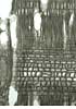 Ring-porous to semi-ring-porous. Pores generally solitary and relatively widely spaced. Growth ring boundaries very distinct. Parenchyrna apotracheal, diffuse, rarely paratracheal. Ground tissue cells thick-walled. Pith: In the pith small groups and rows of thick-walled cells are situated between large thin-walled cells. |