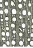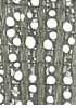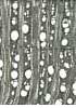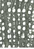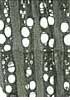 Simple perforation plates in large vessels, Occasionally scalariform perforation plates in small latewood vessels. Rays homogeneous to heterogeneous, often with one to two rows of square to upright marginal cells. Libriform fibres, occasionally septated, present. In the latewood vascular tracheids present. Principally scalariform vessel pits, but numerous transition forms from bordered to scalariform pits present. In enlarged procumbent ray cells raphides present. |