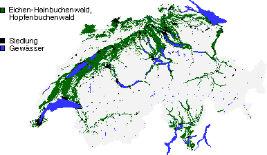 Potentiell natürliche Verbreitung der Eichen-Hainbuchen- und Hopfenbuchenwälder nach einer Erwärmung um 1.2°C |