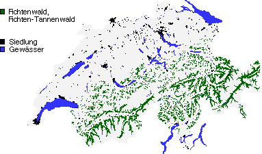 Potentiell natürliche Verbreitung der Fichten-Tannen- und Fichtenwälder nach einer Erwärmung um 1.2°C ohne Verschiebung der Waldgrenze |
