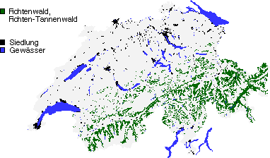 Potentiell natürliche Verbreitung der Fichten-Tannen- und Fichtenwälder nach einer Erwärmung um 2.4°C mit einer Verschiebung der Waldgrenze |