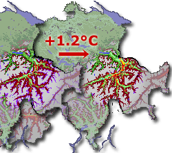 Für jede Region der Schweiz wird die mögliche Waldveränderung unter einer Temperaturerwärmung in einem Vorher-Nachher-Szenario illustriert. |