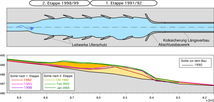 | Bei der Aufweitung der Emme bei Aefligen ("Birne Emme") wurde das Flussbett auf einer Länge von 30m auf 65-85m aufgeweitet (siehe Abb.1). Die Sohlenaufnahmen zeigen ein maximales Gefälle in der Aufweitung von 4.1‰ (1999). Das ist nur wenig mehr als das ursprüngliche Gefälle von 3.8‰ (1990). Aus den Sohlenaufnahmen lässt sich darum auch nicht eindeutig nachweisen, dass die Aufweitung stabilisierend auf die Sohle wirkt. Die Sohle liegt im Oberwasser der Aufweitung zwar rund 8cm höher als noch 1990, Sohlendifferenzen derselben Größenordnung sind aber auch im Unterwasser fest zu stellen. Berücksichtigt man aber, dass die Emme einem allgemeinen Erosionstrend unterliegt und dass für den betreffenden Abschnitt eine Sohlenerosion prognostiziert wurde (VAW, 1987), ist die Bilanz dennoch positiv. | |||||
