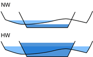 Durch eine Aufweitung erhöht sich der Abflussquerschnitt eines Gerinnes. Dadurch liegt der Hochwasserspiegel in der Aufweitung tiefer als im kanalisierten Gerinne (= Gewinn an Freibordhöhe) (siehe Abb.1). Zudem sind die Fliessgeschwindigkeiten geringer. Beide Faktoren reduzieren die Überflutungsgefahr. Es ist jedoch zu beachten, dass am oberen Ende einer langen Aufweitung der Gewinn an Freibordhöhe durch die Sohlenhebung mit der Zeit wieder dezimiert werden kann. In Zusammenhang mit Hochwasserschutzmassnahmen wird Aufweitungen häufig eine grosse Retentionswirkung zugesprochen. |