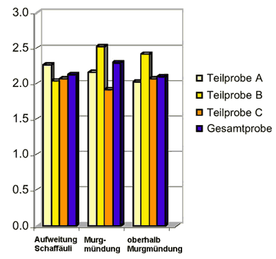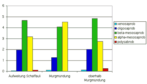 Die organische Belastung (= Saprobität) eines Gewässers lässt sich unter anderem anhand der im Wasser lebenden Wirbellosen (Benthos) bestimmen. Die grosse Aufweitung "Schaffäuli" an der Thur deutet auf einen möglichen, positiven Einfluss der Aufweitung auf die Wasserqualität hin (Abb. 1 und 2): Oberhalb der Mündung der Murg in die Thur zeigen die Benthosorganismen eine mässig organische Gewässerbelastung (beta-mesosaprob) an. Durch den Zufluss der Murg verschlechtert sich die Wasserqualität und weißt eine leicht erhöhte organische Belastung auf. In diesem Abschnitt sind vermehrt alpha-mesosaprobe Benthosorganismen (Anzeiger für eine starke organische Gewässerbelastung) anzutreffen. Im Schaffäuli (grosse Aufweitung) unterhalb der Murgmündung nimmt der Anteil dieser Arten jedoch wieder ab. Es ist davon auszugehen, dass sich Aufweitungen grundsätzlich positiv auf die Selbstreinigungskraft auswirken, eine Quantifizierung ist jedoch derzeit noch nicht möglich. |
