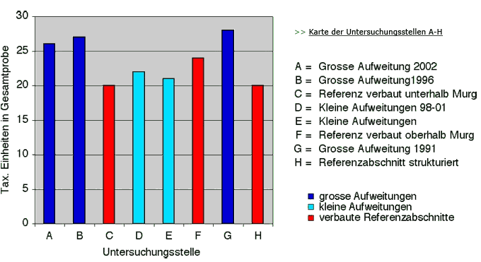 Dabei scheint der Zusammenhang jedoch nicht linear zu sein, denn die Untersuchungen an der Thur zeigen, dass sich die Artenzahlen zwischen kleinen Aufweitungen und kanalisiertem Gerinne kaum von einander unterscheiden. Erst die grossen Aufweitungen weisen eine deutlich höhere Artenzahl als die begradigten Thurabschnitte auf (Abb.2).
