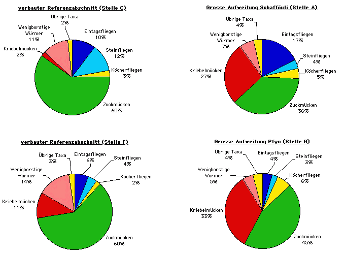 Ein Vergleich der Artenzusammensetzung zeigt, dass in den verbauten Gerinneabschnitten Arten dominieren, die eine mässig starke Strömung bevorzugen. Neben diesen kommen in den Aufweitungen zusätzlich solche Arten vor, die starke bis schiessende oder strömungsarme bis –freie Zonen bevorzugen (Tab.1).