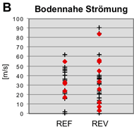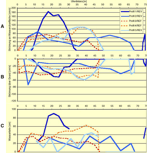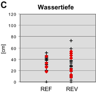 Im Gegensatz zu den begradigten Gerinneabschnitten zeigen die Aufweitungen eine grössere Variabilität der Wassertiefen und Strömungsgeschwindigkeiten (Abb.3, Abb.4). Denn durch die grossen Aufweitungen an der Thur wurden neu sowohl Seitentümpel u. -gerinne als auch Riffle mit starken Strömungen geschaffen, die von zusätzlichen Arten besiedelt werden.