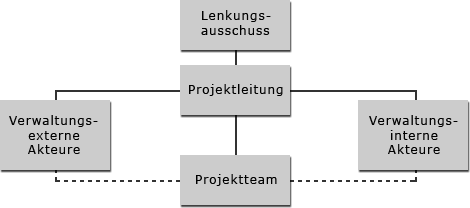 | Die politische Verantwortung für das Projekt wird oftmals durch einen Lenkungsausschuss übernommen. Der Lenkungsausschuss legt in Absprache mit der Projektleitung die strategisch-politischen Leitlinien des Projekts fest. | ||||