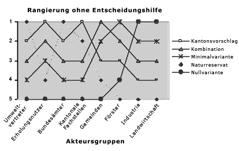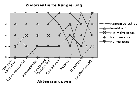 kann eine Rangierung der Varianten erfolgen. Diese Rangierung wird auch "zielorientierte Rangierung" genannt. Ein Beispiel einer zielorientierten Rangierung ist in Abbildung 1 (oben) dargestellt. Zielorientierte Bewertung und eine Bewertung ohne formale Entscheidungshilfe (Abbildung 1 unten) können einen wichtigen Beitrag zur Konfliktlösung leisten: