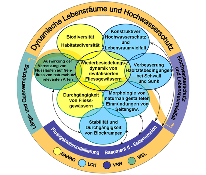 Das Forschungsprojekt "Integrales Flussgebietsmanagement" ist unter dem Leitmotiv "Dynamische Lebensräume und Hochwasserschutz" auf zwei Themen fokussiert. Einerseits wird die Wechselwirkung zwischen konstruktiven Hochwasserschutzmassnahmen und der Lebensraumvielfalt in Fliessgewässern untersucht. Anderseits werden die Auswirkungen der Längs- und Quervernetzung der Fliessgewässern auf deren Durchgängigkeit und den Genfluss betrachtet. Zusätzlich werden die Dimensionierungswerkzeuge zur Lösung der entsprechenden flussbaulichen Fragestellungen erarbeitet.