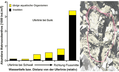 Diese als Wasserwechselzone bezeichneten Uferstreifen sind biologisch weitgehend entwertet (degradiert). Während flache Uferpartien in vielen Flüssen die am vielfältigsten besiedelten und genutzten Lebensräume des ganzen Gewässers sind, können sich in der wechselfeuchten "Verödungszone" von Schwallstrecken nur mehr wenige Pflanzen und Tiere halten, die das regelmässige Trockenfallen tolerieren. Zu diesen resistenten Organismen gehören in der Rhone und anderen Gewässern bestimmte Arten von fädigen Grünalgen und die Larven gewisser Köcherfliegen. Wie gering aber die Dichte (Abundanz) des gesamten Makrozoobenthos im Vergleich zum flusseinwärts anschliessenden, ständig benetzten Uferbereich bleibt, ist in Abbildung 1 ersichtlich. In der Wasserwechselzone der Rhone wurde eine Verlegung und Verstopfung (Kolmation) mit feinen Sedimentfraktionen festgestellt (Abbildung 1). Derselbe Befund liegt auch schon von anderen alpinen Gewässern vor und wurde dort für den Rückgang gewisser, v.a. grösserer Organismen der Uferfauna verantwortlich gemacht. Auf der anderen Seite haben die Untersuchungen an der Rhone aber auch ergeben, dass die Kolmation in der Wasserwechselzone von Schwallstrecken offenbar deutlich geringer ist als im ständig benetzten Sohlenbereich unmittelbar daneben.