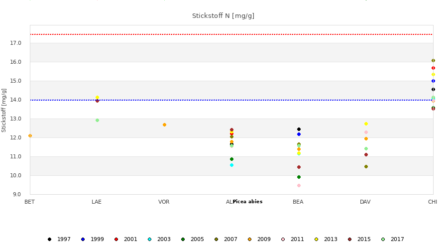 Les lignes horizontales pointillées délimitent la gamme de nutrition optimale d’après Mellert & Göttlein (2012). Les masses et concentrations ont été déterminées sur les feuilles ou aiguilles séchées à 65°C.
